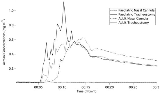 There was a noticeable difference between the aerosol concentrations measured for the nasal cannula and the tracheostomy interface during simulated paediatric breathing. However, the same variations did not occur between the nasal cannula and tracheostomy interface for the adult patient or between adult and paediatric patients with the tracheostomy interface.