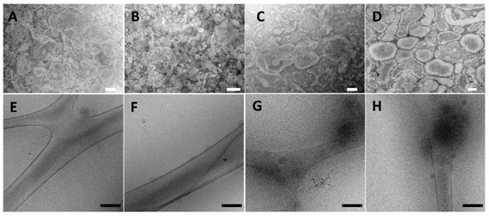 TEM images (upper panel) of three-dimensionally-structured hybrid 59:2 vesicles (A), 53:10 vesicles (B), 69:2 vesicles(C), and 63:10 vesicles (D). Scale bars represent 100 nm. Cryo-TEM images (lower panel) of diluted three-dimensionally-structured hybrid 59:2 vesicles (E), 53:10 vesicles (F), 69:2 vesicles (G), and 63:10 vesicles (H). Scale bars represent 500 nm.