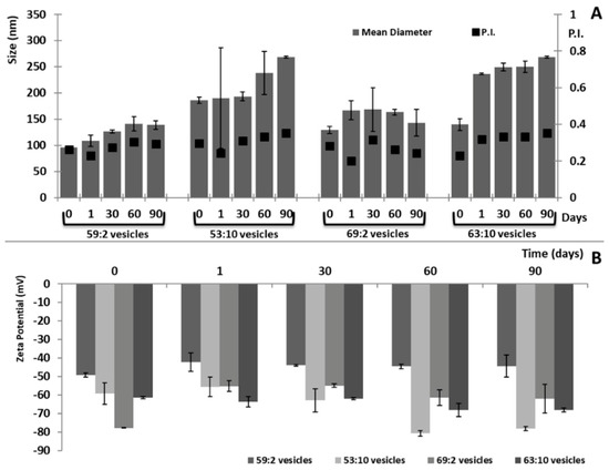 Vesicle stability was evaluated for 90 days at room temperature (25 ± 1 °C, Figure 2). The values of the checked parameters (mean diameter, polydispersity index, and zeta potential) of 59:2 and 69:2 vesicles remained almost constant over all the storage periods (variation < 10%, p > 0.05), while 53:10 and 63:10 vesicles, containing a higher amount of water, suffered a significant change in size, as they reached ≈238 nm in diameter in a short time. The presence of water probably reduced the stability of the vesicles favoring its aggregation or fusion.