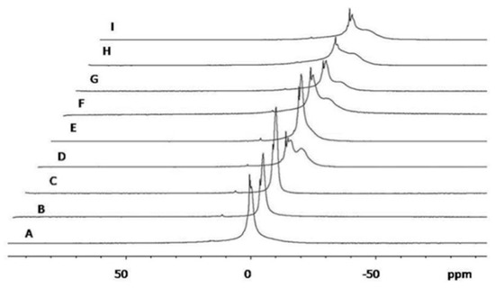 Representative spectra of empty liposomes (A), empty (B) and clotrimazole-loaded (C) 59:2 vesicles, empty (D) and clotrimazole-loaded (E) 53:10 vesicles, empty (F) and clotrimazole-loaded (G) 69:2 vesicles, and empty (H) and clotrimazole-loaded (I) 63:10 vesicles. Spectra are presented with a horizontal offset toward the right of 5 ppm to facilitate a clear view.