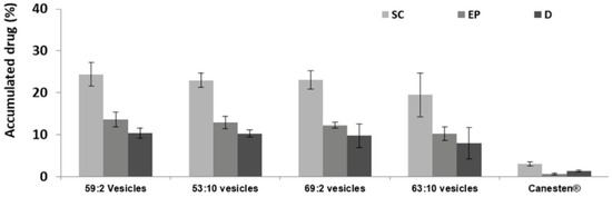 Cumulative amount of clotrimazole accumulated in the stratum corneum (SC), epidermis (EP), and dermis (D) after 8 h of treatment with the clotrimazole-loaded three-dimensionally-structured hybrid vesicles or Canesten® cream. Bars represent the mean ± standard deviation (error bars) of at least six independent experimental determinations.