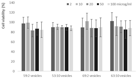 The toxicity of the different clotrimazole-loaded vesicles was evaluated using keratinocytes (HaCat) and measuring the cell viability using the MTT assay (Figure 5).