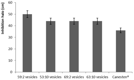 In vitro inhibition halo against C. albicans provided by the clotrimazole-containing, three-dimensionally-structured hybrid vesicles or Canesten® cream. Data are reported as mean values ± standard deviation (error bars) of six values.