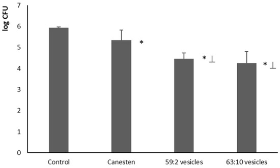 Total count of C. albicans (CFU) in the skin samples of mice 24 h after the application of Canesten® cream and clotrimazole-loaded 59:2 and 63:10 hybrid vesicles. Values are expressed as mean ± standard deviation (n = 4). The symbol * indicates values that were statistically different from control group and the symbol ⊥ indicates values that were statistically different from Canesten® (reference group).
