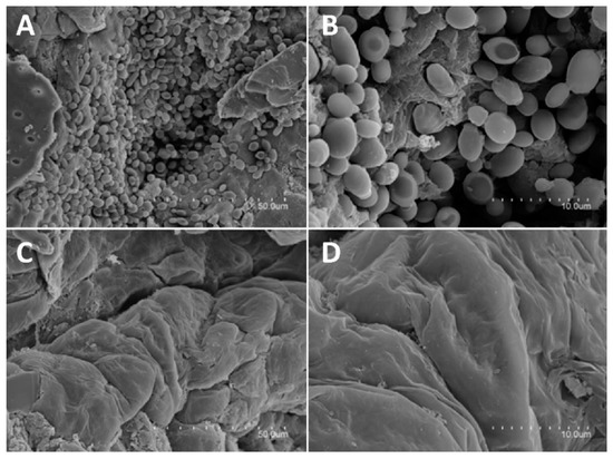 Scanning electron microscopy images of skin samples obtained from C. albicans-infected (A,B) and non-infected (C,D) mice. Images A and C were obtained using a 1100× magnification and B and D using a 4000× magnification.