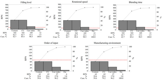 The IQAs of the mixture, which is the intermediate product for the blending process, were determined based on the effect of homogeneity of mixture directly related to the CQAs of the finished drug product. The IQAs were defined by the drug content, CU, and the Carr index, and they were used in the RA to identify the CPPs for the blending process. As shown in Table 2, the process parameters for the blending process were classified into three risk levels—low (marked in green), medium (marked in yellow), and high (marked in red)—according to their RPN scores for the IQAs describing the homogeneity of mixture. In the blending process, the filling level, rotational speed, and blending time were found to put the IQAs under medium to high risk. These results were determined based on the expertise and experience from previous studies on related processes [56,57,58]. In addition, the Pareto chart was provided on the basis of the RPN scores for each process parameter, as shown in Figure 2. In this chart, the RPN scores for IQAs of the filling level, rotational speed, and blending time were above the threshold value, while the RPN scores for IQAs of the order of input and manufacturing environment were below the threshold value. In addition to this, the Pareto chart, with respect to the filling level, rotational speed, and blending time, showed that the percentage RPN and percentage cumulative RPN for the drug content and CU accounted for 30–40% and 70–80%, respectively. Based on these results, the filling level, rotational speed, and blending time were adopted as CPPs for the careful management, and they were evaluated as control factors with the following Box–Behnken design.