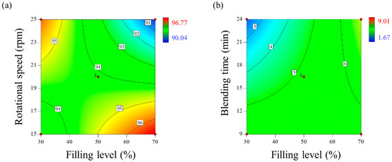 All the control factors have a significant effect on the drug content (p value < 0.05). In addition, the actual model R2, adjusted R2, and predicted R2 were 0.9829, 0.9733, and 0.9274, respectively (Table 4). It can be concluded that the closeness of these values is suggestive of the goodness of fit. The empirical model demonstrated that the filling level (x1) and rotational speed (x2) had negative effects on the drug content, while blending time (x3) had a positive effect on the same. The mutual interaction of x1 and x2 decreased the drug content, while that of x2 and x3 increased the same. Based on Equation (11), the two-dimensional contour plot was generated for the x1 and x2, which had the most significant effect on the drug content, as shown in Figure 3a. The contour plot shows that the drug content increases at a lower filling level and faster rotational speed, or at a higher filling level and slower rotational speed. These results suggest that the difference in dynamic behavior of the powder bed in the V-blender occurs according to the filling level and rotational speed [59,60]. The lower filling level and higher rotational speed allow the powder bed to rotate faster in the blender, thereby increasing the drug content [60]. In addition, the increase in drug content at higher filling levels and lower rotational speeds is not fully understood; however, it can be inferred that these conditions have a positive effect on the drug content by blending not only the surface region but also the central region of the powder bed [28].