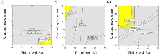 The filling level (x1) and blending time (x3) also have a significant effect on the CU (p value < 0.05), while the rotational speed (x2) is confirmed to have no significant effect (p value > 0.05). In addition, the actual model R2, adjusted R2, and predicted R2 were 0.9597, 0.9435, and 0.9018, respectively (Table 4). It can be concluded that the closeness of these values is suggestive of desirability of fit. The empirical model suggests that the x1 has a positive effect on the CU, while the blending time has an x3 on the same. The mutual interaction between x1 and x3 has a positive effect on the CU, while that between x2 and x3 has a negative effect on the same. The relationship between the control factors and the CU is presented as the two-dimensional contour plot for the x1 and x3 that have been identified to have a significant effect on the CU, based on Equation (12), as shown in Figure 3b. The CU decreased at a lower filling level and longer blending time, because they allow the blending of the whole area, including the surface and central regions of the powder bed, as suggested by previous studies [56,60]. Therefore, a low filling level and long blending time are recommended to ensure the CU.