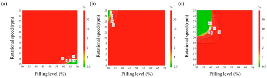 Operating spaces derived by applying Monte Carlo simulation to corresponding design spaces: blending time at (a) 9 min, (b) 16.5 min, and (c) 24 min. The green spaces denote parts with a failure probability of less than 1% of the target values of IQAs.