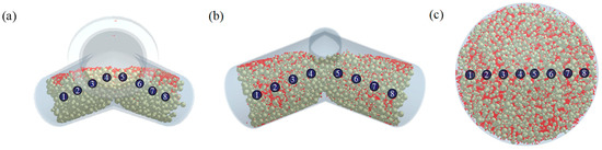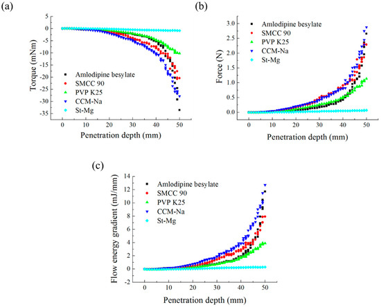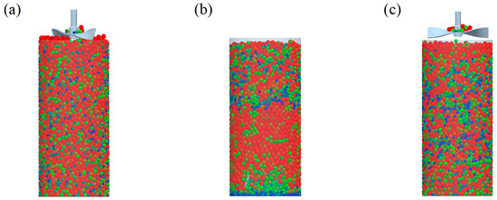 The three tests were performed by iteratively adjusting the input parameters in the simulations of three tests until the simulation results were in agreement with the experimental results (within 10.0% of relative biases). Through the calibration approach, the obtained experimental and simulation results for each bulk test are listed in Table 6. Amlodipine besylate and St-Mg were shown to have high static and dynamic angles of repose as compared with other materials, which may have resulted from their poor flowability. To achieve a high angle of repose, the coefficients of static and rolling frictions of these materials were set higher than those of the other materials in the simulations. This is because high coefficients of static and rolling frictions offer a large resistance to linear motion and rotational motion of a particle, which leads to poor flowability of the materials [61,62]. It was also reported that the high coefficients of static and rolling frictions contribute positively to the increase of the static and dynamic angles of repose [63,64]. In addition, the simulation results of the BFE test were obtained in the BFE test simulation, which was conducted with the conditioning cycle and test cycle. The conditioning cycle was performed after the completion of one test cycle to prevent the change in particle arrangement due to the size distribution in each material, as shown in Figure 6. The figure consists of examples of the tests performed on the particles of amlodipine besylate. The green, blue, and red particles in the figure denote D10, D50, and D90, respectively. In the initial state, the particles were distributed uniformly (Figure 6a), however, the segregation of particles according to the size distribution can be observed after one test cycle (Figure 6b). This particle segregation is mitigated by performing a conditioning cycle (Figure 6c). The torque and force acting on the impeller blade during the test cycle in the BFE test simulation are shown in Figure 7a,b. The flow energy gradient obtained based on torque and force is shown in Figure 7c. It can be observed that each amlodipine formulation material, except for St-Mg, exhibits a significant resistance. St-Mg particles exhibit low torque and force, which may be a result of their low bulk density (0.20 g/mL) and poor flowability. This is because low bulk density and poor flowability reduce the flow region of the low stiffness material around the impeller blade, thereby reducing the energy required by that blade [65]. The BFE for each amlodipine formulation material was calculated by substituting the torque and force obtained from the BFE simulation into Equation (10) (Table 6). Consequently, the absolute and relative biases for each bulk test are similar to one another, within a tolerance of approximately 10%. Based on these results, the interaction parameters for particle–particle and particle–geometry, as well as material properties for respective formulation materials, were determined and are listed in Table 7. Furthermore, the material properties of the geometry made entirely of stainless steel are presented based on previous studies [52,66].