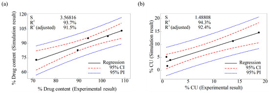 Fitted line plots for the experimental and simulation results at laboratory-scale: (a) drug content (%) and (b) CU (%). Black line, red dotted line, and blue dotted line denote regression, 95% confidence interval (CI), and 95% prediction interval (PI), respectively.