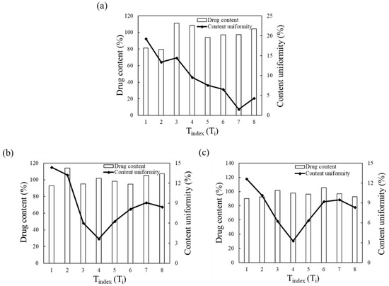 Graphs for each blending simulation result according to Ti: (a) V-blender at laboratory-scale, (b) V-blender at pilot-scale, and (c) double-cone blender at pilot-scale. For each graph, the bars corresponding to the left axial and the line corresponding to the right axial represent the drug content (%) and CU (%), respectively.