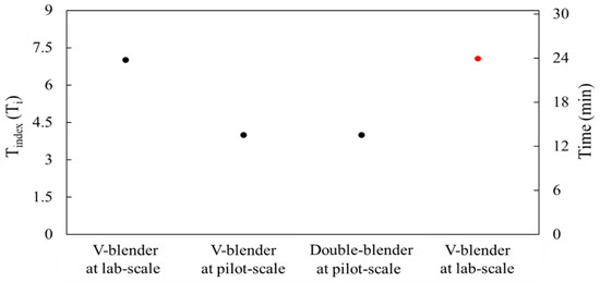Comparison of Ti values and blending time (min) that satisfied the target values for the drug content and CU. The black points corresponding to the left axial are the Ti values for each blending simulation and the red point corresponding to the right axial is the blending time for the blending experiment at laboratory-scale.