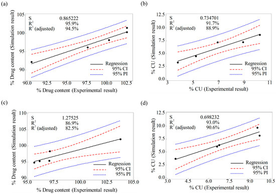 Fitted line plots of the experimental and simulation results at pilot-scale: (a) drug content (%) in V-blender, (b) CU (%) in V-blender, (c) drug content (%) in double-cone blender, and (d) CU (%) in double-cone blender. The black line, red dotted line, and blue dotted line denote the regression, 95% confidence interval (CI), and 95% prediction interval (PI), respectively.