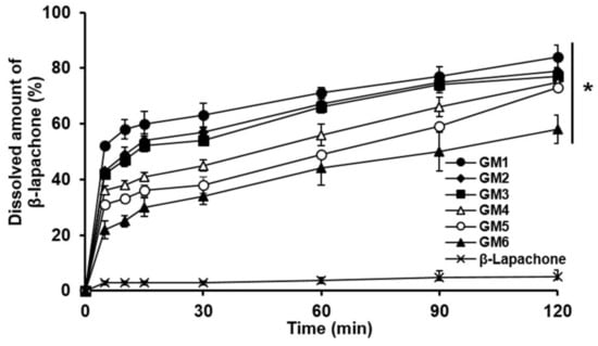 In vitro drug-dissolution profiles of coground mixtures with different compositions evaluated in comparison with raw β-lapachone powder. Values are mean ± SD (n = 3). Asterisk denotes a statistical difference at p < 0.001 between drug-dissolved amounts evaluated with different coground mixtures and that assessed with raw β-lapachone powder at 120 min.