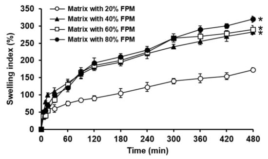 Swelling indices of FPM-based matrices incorporating FPM at different weight fractions of 20%, 40%, 60%, and 80%, assessed for 8 h in pH 1.2 simulated gastric fluid. Values are mean ± SD (n = 3). Asterisk means a statistical difference at p < 0.001 between the swelling index of FPM-based matrix containing FPM at 20% weight fraction and those of FPM-based matrices incorporating FPM at weight fractions of 40%, 60%, and 80%, evaluated at 8 h.
