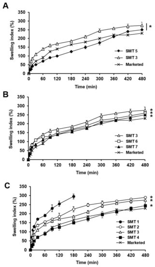Swelling behaviors of (A) SMTs containing FPM (SMT 3) or non-FPM (SMT 5), (B) SMTs incorporating PEO of 1000 (SMT 3), 4000 (SMT 6), or 8000 kDa (SMT 7), and (C) SMTs with 1000 kDa PEO at different weight fractions of 10% (SMT 1), 15% (SMT 2), 20% (SMT 3), or 30% (SMT 4) assessed in pH 1.2 simulated gastric fluid in comparison with a marketed swelling gastroretentive tablet. Values are mean ± SD (n = 3). In Panel A, asterisk indicates a statistical difference at p < 0.05 between swelling indices of SMTs 3 and 5, evaluated at 8 h. In Panels B and C, asterisk denotes statistical difference at p < 0.05 between the swelling index of the marketed product and those of SMTs assessed at 8 h. As for SMT 1, the swelling index could not be evaluated after 3 h because it was collapsed at 3 h due to its weak mechanical strength.