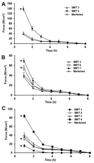 Profiles of mechanical strength of (A) SMTs prepared with FPM (SMT 3) or non-FPM (SMT 5), (B) SMTs containing PEO of 1000 (SMT 3), 4000 (SMT 6), or 8000 kDa (SMT 7), and (C) SMTs with 1000 kDa PEO at different weight fractions of 10% (SMT 1), 15% (SMT 2), 20% (SMT 3), or 30% (SMT 4) evaluated in pH 1.2 simulated gastric fluid for 8 h in comparison with the marketed product. Values are mean ± SD (n = 3). Asterisk indicates a statistical difference at p < 0.01 between mechanical strengths of the marketed product and SMTs evaluated at 1 h.