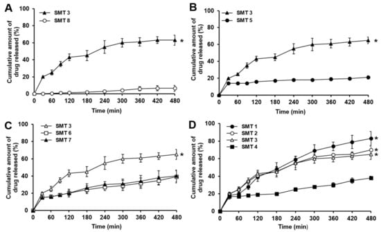 An in vitro drug-release study was performed to evaluate the drug-dissolution behavior of the SMTs in accordance with the same procedure of the drug-dissolution test as described above, except aliquots of 1 mL were withdrawn from the dissolution media at predetermined time intervals of 0.5, 1, 1.5, 2, 3, 4, 5, 6, 7 and 8 h.