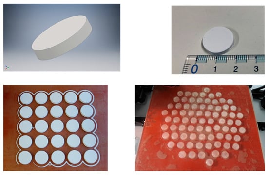 The PVTPs were designed using the Inventor program. The PVTP size was 14 mm diameter and 3 mm thickness. Batches of 25 were printed on the Lulzbot Mini and 50 on the Lulzbot Taz 3D printer. As with all FDM printing, initially adhesion happens to the print bed surface then to the previously printed layers, hence the importance of using the correct bed temperature for each source of filament [23].
