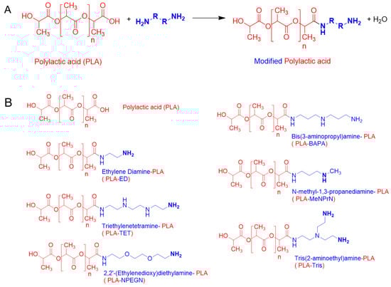 (A) Surface modification reaction for PLA with amines. (B) Chemical structure of PLA and the PLA-based amine-derivatives.
