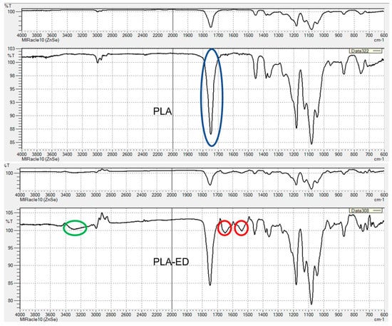 FT-IR spectra of PVTPs of PLA and PLA-ED. The ester C=O band is highlighted by a blue oval, the amide C=O bands by red circles, and the amide NH band by a green oval. From the presence of only the ester C=O stretch in PLA and the presence of both C=O amide and NH amide bands in the PLA-ED spectra, it is clear that the amide functionalization reaction has occurred, as was previously observed by time of flight secondary ion mass spectrometry (TOF-SIMS) for the surface modification of poly-ethylene-terephthalate (PET) by adenosine mono-phosphate (AMP) under the same conditions as in the current study [24].
