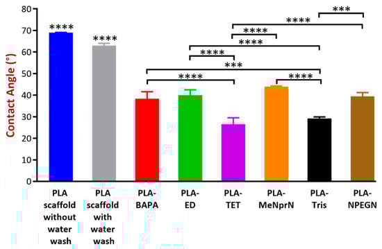 The contact angle values obtained are given in Figure 4. The contact angle measurement results can be sorted based on a decreasing volume: PLA PVTP without water wash = PLA PVTP with water wash > PLA-MeNprN > PLA-ED > PLA-NPEGN > PLA-BAPA > PLA-Tris > PLA-TET. The contact angle values of our PVTPs were between 26.5 ± 3.0° and 69 ± 0.1°, showing that all the PVTPs are hydrophilic and that the chemical modification by introduction of polar oligo-amine functions results in increasing hydrophilicity. As expected, the unmodified PVTPs show the highest contact angles.