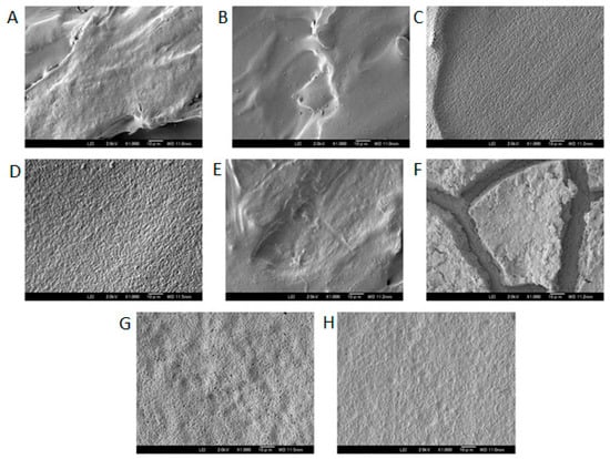 The surface of the PLA PVTP and its modifications were tested using a scanning electron microscope. In our study, both the untreated surface and the deionized water washed surfaces had the general aspect of a stepped surface, with some small deviation from planarity for the untreated surface. After washing the surface appeared smoother, correlating with the change in the contact angle. For the six treated surfaces shown in Figure 5 below (C:PLA-BAPA, D:PLA-ED, G:PLA-Tris, and H:PLA-NPEGN), all appeared flattened with respect to the initial surface, however all showed a large number of indentations. PLA-Tris showed ca 1 µm pore diameters. In the case of the TET modified surface, the overall aspect was close to that of the untreated printed surface, and small indentations were visible with diameters of ca 100–200 nm. Finally, in the case of the MeNprN modified surface, etching appeared to have occurred and the surface was separated into iceberg-like systems overlying a flat surface. This confirms that the surface of the 3D printed PLA PVTPs had been modified, which confirms the formation of separated plates on the printed surface.