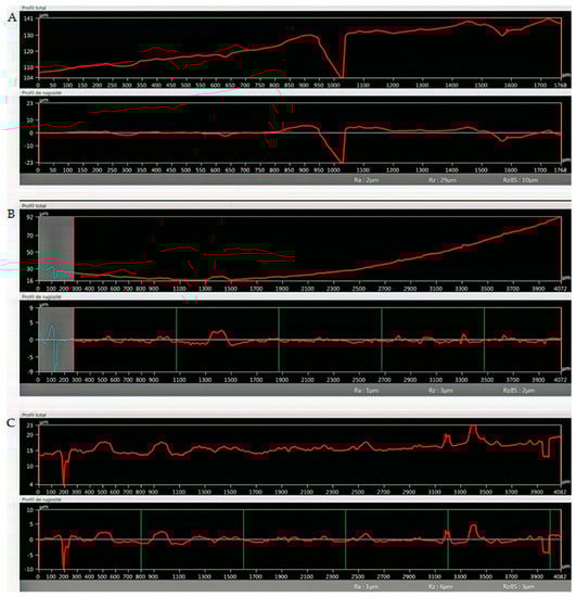 Line sections through printed PVTPs. (A) PLA unmodified 1768 µm length, (B) PLA-ED 4082 µm length, and (C) PLA-NPEGN 4082 µm. Rz values of 29 µm for PLA, 3 µm for PLA-ED, and 6 µm for PLA-NPEGN are observed.