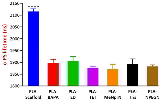 Figure 7 illustrates the average discrete o-Ps lifetime values of various samples. The higher lifetime values indicate higher free volume holes between the polymeric chains, and also residual space between filaments. The results showed that the modified polymeric bases (BAPA through NPEGN) were of similar o-Ps lifetimes, thus were free volume holes, while the PLA PVTP represented significantly higher o-Ps lifetimes. Based on our results, after the modification, PLA-ED and PLA-Tris contained the most free volume in their structures. PLA-MeNprN had the least free volume in its structure. The latter could be explained by the fact that through modification, the amines could be built into the polymeric chains, resulting in smaller free volumes between chains and especially between polymer molecules in the filaments.