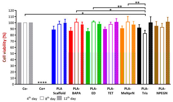 The results are expressed as the percentage of negative or untreated control (Co−). As a positive control (Co+) Triton-X 100 (10% w/v) solubilizing agent was used, which resulted in significant differences from the other examined samples. We compared cytotoxic values and found none of the samples decreased significantly in cell viability compared to the untreated control (Figure 8.) Based on our MTT assay, PLA-TET cytotoxicity did not decrease under 100% in comparison with the negative control. PLA-ED, PLA-BAPA, PLA-Tris, and PLA-NPEGN cell viability values were higher than 90% in the case of prolonged exposure. Based on the ISO 10993-5:2009(E) standard, if the relative cell viability is higher than 70% in comparison with the control group (100%), the materials can be considered non-cytotoxic [41]. According to this regulation, all our PLA PVTPs qualified as cytocompatible.