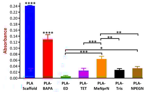 Biofilm formation results are presented as an absorbance value plotted against the examined samples, and all absorbance results were under 0.24. Values are presented as means ± S.D. Experiments were performed in triplicate, n = 3. PLA PVTP and BAPA modification have significantly higher absorbance results than other modifications. MeNprN has higher absorbance results than 0.05 but TET, Tris, NPEGN, and ED have lower absorbance results than 0.05. In comparison with the other PVTPs, ED resulted in the smallest absorbance value. Error bars represent SD; *, **, ***, and **** indicate statistically significant differences at p < 0.05, p < 0.01, p < 0.001, and p < 0.0001, respectively.