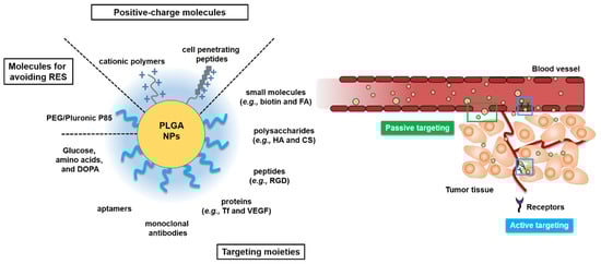 For prolonged circulation in the blood, hydrophilic molecules such as PEG, poloxamers, and Tween 80 are usually conjugated on the surface of PLGA NPs. These hydrophilic molecules on the NPs can infer stealth properties, leading to the evasion of phagocytic uptake by the reticuloendothelial system (RES), and a prolonged time in the systemic circulation [81]. Furthermore, PLGA NPs conjugated or coated with positively-charged molecules such as CS can be taken into the tumor cells more easily via adsorptive-mediated transcytosis [82].
