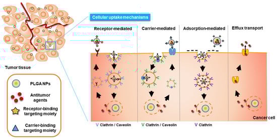 Most NPs carrying anti-tumor agents, including PLGA NPs, can be internalized by endocytosis into the tumor cells. In receptor-mediated endocytosis, the NPs can be efficiently internalized into cells by the specific binding of targeting moieties anchored on the PLGA NPs and the corresponding receptors expressed on the tumor cell membrane or tumor vasculatures [102]. These specific ligand–receptor complexes include the biotin–biotin receptor, HA-CD44 receptor, anti-epidermal growth factor (EGF) antibody (Ab)-EGF receptor (EGFR), FA-folate receptor, Arg-Gly-Asp (RGD)-based peptide-integrin αvβ3, and Tf–Tf receptor (Table 1).