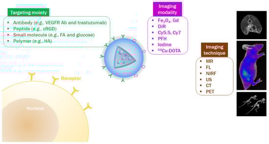 There has been much progress in the development of nanomedicines for use cancer imaging and therapy [1,2,3,4,5,6,7,8,9,10,11,12,13,14,15,16,17,18,19,20]. To increase the potential for clinical application, nanomedicines with increased precision and safety have recently been designed and evaluated. Following intravenous administration, particles with a certain size range can localize to the tumor region through an “enhanced permeability and retention (EPR) effect” [21,22,23]. Molecules or particles with a size of >40 kDa (renal clearance threshold) may be present in the systemic circulation for a prolonged period [22,23]. Leaky tumor vasculature and insufficient lymphatic drainage of tumor tissue can increase the permeability and accumulation of particles [24]. Although the EPR effect has been proved in many animal studies, its usefulness for clinical application is still controversial [21]. The pathophysiological states are different according to the animal species (rodent versus human), tumor types originated from same source, and primary versus metastatic tumors in the same patient [21]. Consideration of the heterogeneity of EPR effect is necessary for the successful translation of nanomedicines to the clinical situation [21]. As drug delivery via EPR does not usually occur in normal tissues, it can be used as a passive tumor-targeting strategy [25]. However, the heterogeneity of tumor tissue, including highly hypovascular areas and necrotic tissues, frequently observed in large tumors may limit the efficiency of particle delivery. In addition to various factors that modulate the EFR effect [26] (e.g., bradykinin, nitric oxide derivatives, prostaglandins, angiotensin-converting enzyme inhibitors, and vascular endothelial growth factor [VEGF]), ligand–receptor interactions have been introduced as an active tumor-targeting strategy [27]. Ligands can be selected to bind receptors that are overexpressed in cancer cells compared with normal cells [27]. Receptors in tumor cells (e.g., transferrin [Tf] receptor, folate receptor, lectins, and epidermal growth factor receptor [EGFR]) or on the tumoral endothelium (e.g., VEGF receptors, αvβ3 integrin, vascular cell adhesion molecule-1 [VCAM-1] and matrix metalloproteinases [MMPs]) can be targets of ligand-tethered nanosystems [27]. Recently, internal (e.g., pH, enzyme, and redox state) and external (e.g., temperature, magnetism, and ultrasound) stimuli-sensitive smart nanosystems have been designed to provide more sophisticated drug-release patterns and selective uptake in cancer cells [27]. Additive properties, such as tumor penetration, the induction of apoptosis, and inhibition of metastasis, have been built in nanosystems for use in cancer imaging and therapy [28,29,30,31,32,33,34,35,36,37,38].