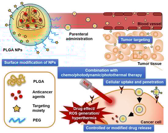 PDT and PTT have gained much attention based on their effectiveness in cancer treatment [7,43,151,152]. Combination treatment with chemotherapy, PDT, and PTT using multifunctional PLGA NPs has been investigated. A photosensitizer (e.g., 5-aminolevulinic acid, hypocrellin A, meso-tetra hydroxyphenylchlorine [mTHPC], pheophorbide a [Pba], and PpIX) and/or photothermal agents (e.g., ICG) can be introduced into PLGA NPs by encapsulation or adsorption [153,154,155,156,157,158]. FA-modified PLGA NPs including Pba have been fabricated, and enhanced anticancer activities based on PDT against gastric cancer (MKN28 tumor) after intravenous injection have been demonstrated [155]. Peng et al. reported the use of polydopamine (PDA) and d-α-tocopheryl polyethylene glycol 1000 succinate (TPGS)-coated DTX-loaded PLGA NPs [159]. When co-treated with NIR laser irradiation, this nanoplatform resulted in an approximately 10-fold reduction in tumor size and weight compared with Taxotere®, a commercial formulation of DTX, in MCF-7/ADR tumor-xenografted mice. This result was explained by the augmented photothermal conservation property by PDA and the reduced multi-drug resistance by TPGS. Similarly, gold- or polyaniline-modified PLGA NPs also resulted in effective tumor suppression in the presence of NIR irradiation [130,160]. These therapeutic advancements were ascribed to the synergistic effects of chemo/photodynamic/photothermal therapy.