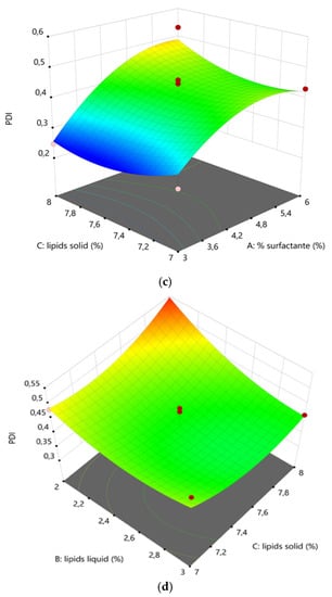 As shown in Figure 2a, the significant factors were the concentration of the surfactant (X1, X) and the combination of surfactant and liquid lipid concentration (X1X2). Figure 2 shows the response surface plots correlating the PDI to the factors investigated.