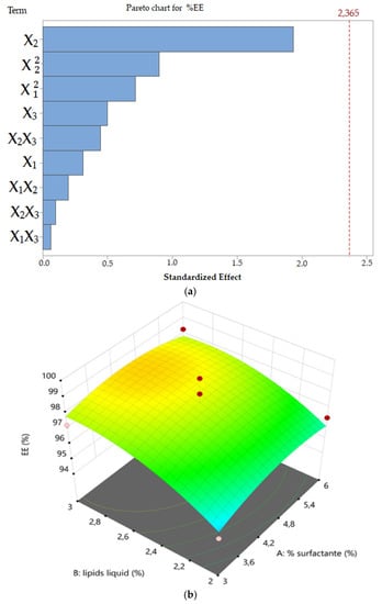 The concentration of surfactant (X1), liquid lipid (X), solid lipid (X3) and interaction between surfactant and liquid lipid (X1X2) and were the factors significantly affecting (p < 0.05) the particle size (Y1) according to ANOVA (see Table 3 and Figure 1a). A positive coefficient value before a factor in the regression equation indicates that the response increases along with the factor and vice versa. The coefficient values show that particle size is strongly dependent on the concentrations of TPGS. In fact, as shown in Figure 1b, when maintaining the Ucuùba fat (solid lipid) concentration constant, lipid nanoparticles particle size decreased when the concentrations of Capryol™ 90 (liquid lipid) and TPGS (surfactant) increased (Figure 1b).