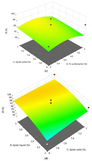 In several studies related to the optimization of NLC production it was observed that the relative concentration of surfactant and lipids strongly affects the stability of the formulation []. The physical-chemical and biopharmaceutical characteristics of NLC, such as size, entrapment efficiency (EE), physical stability, drug release and morphology, are also strongly influenced by the choice and amount of lipids and surfactant [,,]. Thus, an optimization of NLC production with the aid of design of experiment could be carried out with the objective of modulating the amount of liquid and solid lipids and surfactant to obtain the most desirable properties in terms particle size, entrapment efficiency and stability. Response surface method (RSM) is one of the prevalent approaches in the design of the experiments, which involves the use of different experimental designs to generate polynomial mathematical relationships mapping of the response over the experimental domain with the aim to predict the outcome of a process or select the optimal process parameters []. Box-Behnken design (BBD) is a type of RSM and is an independent, rotatable or nearly rotatable, quadratic design with the process variable combinations at the midpoints of the edges of the process space and its center. A significant advantage of BBD is that it is more cost effective compared to other techniques, such as Central Composite Design, 3-levels factorial design and D-optimal design, as it requires fewer experimental runs and less time for process optimization [,].