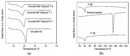 DSC is widely used for investigation the solid state of drugs and excipients, such as lipids. In particular, due to the melting point identification and melting enthalpies determination, this technique highlights the modifications of the crystalline components of the formulations, complementing the XRD data (see Section 3.4.2.). The Ucuùba fat evidenced a melting point of 43 °C while the blends of Ucuùba fat with Capryol™ 90 showed lower melting points (see Figure 7a and Table 6). At the same time a reduction of the melting enthalpy was evident.