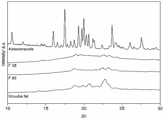 At the same time, it was observed that of the numerous peaks characterizing the diffraction pattern of ketoconazole crystalline powder (see Figure 8) none appeared in the diffractogram obtained for ketoconazole-loaded NLC formulations F 30 and F 85. This possibly indicates that ketoconazole is completely dispersed in the lipid matrix, even if due to the relatively low drug loading the presence of the crystalline drug would be difficult to detect.