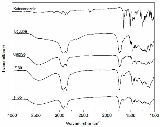 FT-IR spectra of ketoconazole, Ucuùba fat, Capryol™ 90 and of optimized Ucuùba fat NLC formulations F 30 and F 85.