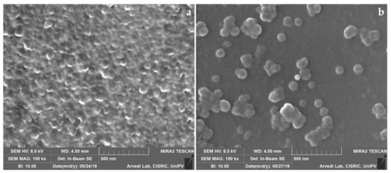 SEM morphological investigation confirmed the NTA results and demonstrated that freeze-dried SFNs presented a spherical shape and smooth surface (Figure 1). Freeze-drying induced the particle aggregation (Figure 1a) but, after suspension and sonication (Figure 1b) nanoparticles appeared to be well dispersed.