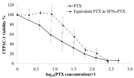 To compare the PTX activity, alone or loaded in SFNs, we reported the CFPAC-1 proliferation results as function of PTX concentration. With the aim to better visually observe the differences between PTX and SFNs-PTX, the log10(PTX concentration)+1 was calculated (Figure 3).