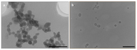 Selected transmission electron microscopy images: (a) Chitosan-mesoporous silica nanoparticles (CHIT-MSNs) (scale bar = 200 nm) and (b) 5-fluorouracil loaded 5% polyethylene glycol-CHIT-MSNs (scale bar = 500 nm).