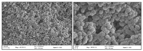 Scanning electron microscopy images of 5% PEG CHIT MSN: (a) scale bar = 200 nm and (b) scale bar = 20 nm.