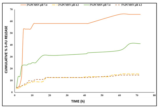 The maximum accumulated release at pH 7.4 was much higher than that at pH 4.2 (Figure 4). The release profile at pH 7.4 displayed an initial rapid release with 80% of the total drug released before 20 h. This may be equated to the rapid diffusion of 5-FU molecules that were adsorbed to the polymeric surface and at the pore entrances of the MSNs. Furthermore, at pH 7.4 there was a higher amount of positively charged species in equilibrium with negatively charged species, and as the positively charged species interacted with the PEG outer coating, more 5-FU were released.