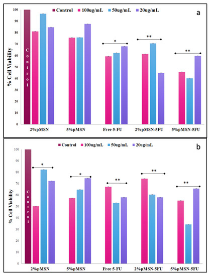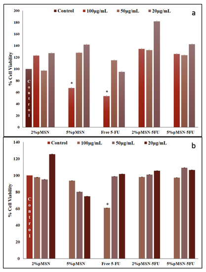 (a) 4,5-dimethylthiazol-2,5-diphenyltetrazolium bromide (MTT) and (b) sulforhodamine B (SRB) cell viability of f-MSNs and 5-FU-loaded MSNs administered at various concentrations (20, 50, and 100 μg/mL) in HEK293 cells. Data is represented as mean ± SD (n = 3). * p < 0.05 was considered statistically significant.