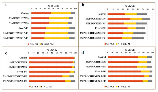 In this work, the cytotoxic, apoptotic, and cell cycle activities of the MSNs were evaluated in four human cancer cell lines to assess the biological performance of MSNs as a drug delivery vehicle in relation to its investigated kinetic release profiles. Supporting previous literature relating the relative biocompatibility and safe pharmacokinetic fate of MSNs, this study found that spherical, weakly positively charged MSNs which were polymer-coated with CHIT and PEG moieties and loaded with 5-FU showed favorable uptake in cancer cell lines, with potent induced cytotoxic, apoptotic and cell-cycle distribution shift events being derived from 48-h exposure treatments in colon, breast, and cervical cancer cells undergoing rapid apoptotic events and shifts in cell cycle distribution. Both apoptotic analyses and cell cycle distribution shifts suggested treatment-dependent induction of cell cycle arrest, as 5-FU mitigated its effects as a synthase inhibitor. Additionally, cytotoxicity results supported an effective reduction of the cancerous cell population at therapeutically relevant dosages. Importantly, no critical cytotoxicity, apoptotic events, or cell cycle shifts occurred within the HEK293 model, alluding to a decreased 5-FU-MSN conjugate uptake into healthy, dividing cells [57,64,65,66].