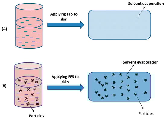 FFSs can be a solution or dispersion in which drug and film-forming excipients are dissolved/dispersed in a volatile solvent(s) [6,24]. The liquid state of the FFS depends on the solubility of drug/excipients or dispersions of encapsulated drug microparticles/nanoparticles in solvents. Upon contact with the skin, the solvents will evaporate and form a film with excipients. Figure 1 illustrates the film formation of FFSs. With solution FFSs, the polymer can have tight contact via molecular interactions to build an even film or smooth film [26]. In contrast, the coalescence of particles after solvent evaporation from dispersion FFSs can result in rough surface films. In both cases, a plasticiser is usually added to the FFS to reduce the brittleness of polymer films [27,28,29].
